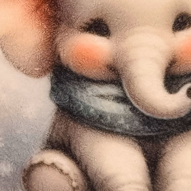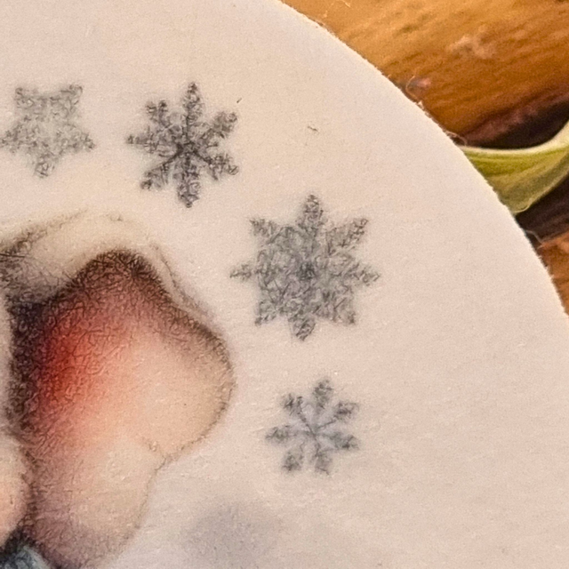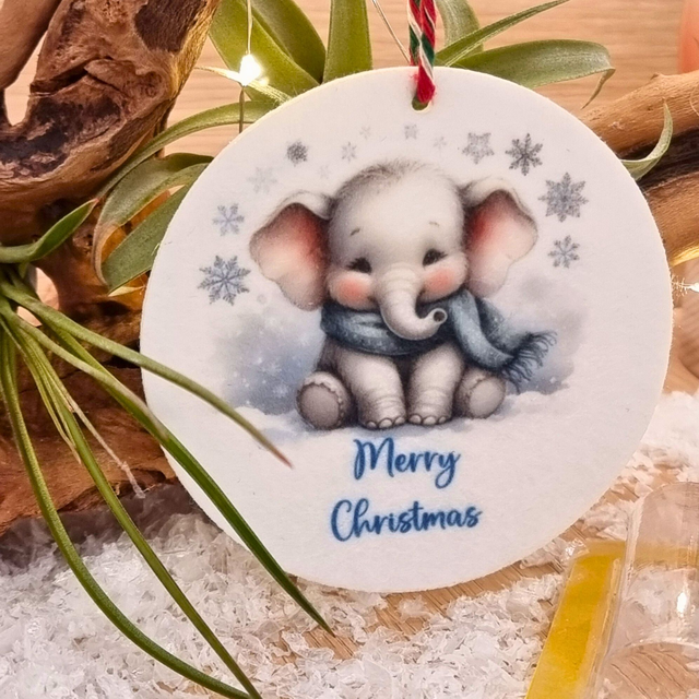 An adorable baby elephant Christmas decoration surrounded by gentle snowflakes, keeping warm in a cosy blue scarf. Each 3.5-inch ornament is double-sided, made from high-quality polyester felt, and finished with a red and white hanging cord. Lightweight, sturdy, and full of winter charm, it’s a sweet addition to any tree or festive gift.