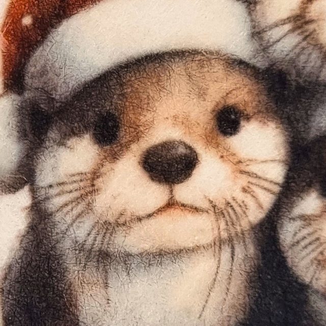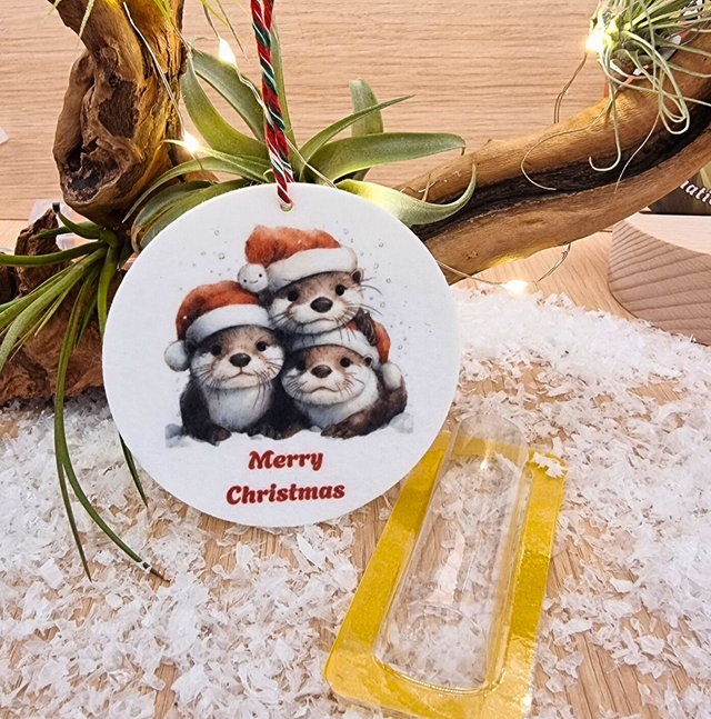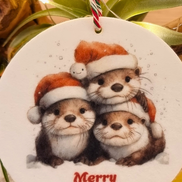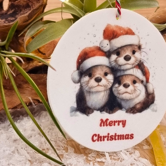 A heart-warming Otter Family Christmas decoration featuring three adorable otters in festive Santa hats with the wording “Merry Christmas.”